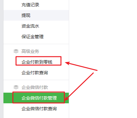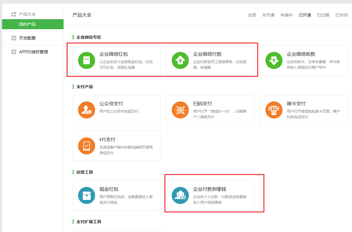 只需在微信支付商戶平臺(tái),產(chǎn)品中心,開(kāi)通【企業(yè)微信付款】與【企業(yè)付款到零錢(qián)】,如下圖所示: